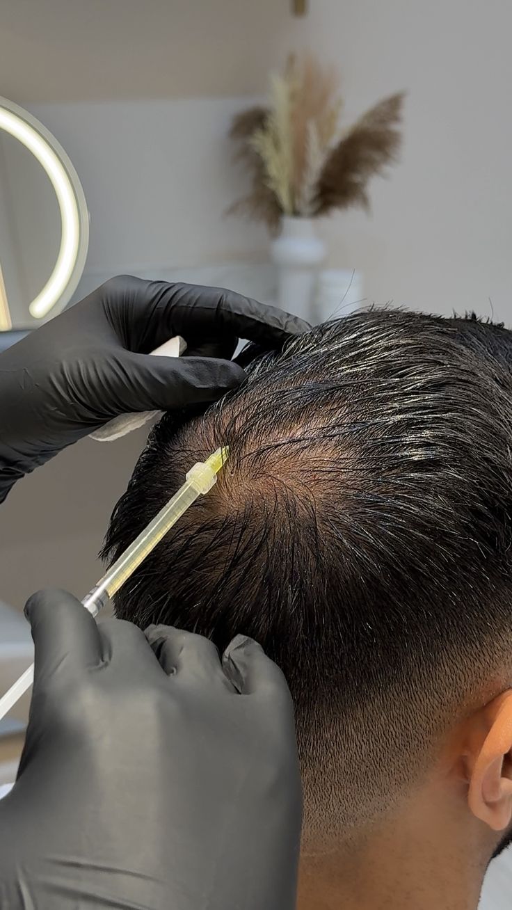 جلسة بسيطة—تعقيم، تخدير موضعي خفيف، ثم حقن محفزات النمو بدقة في الأماكن اللي تحتاج علاج.